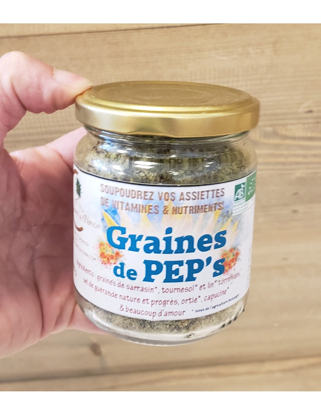 Gomasio est un condiment composé d'un mélange de sarrasin, tournesol et lin torréfiés, sel de Guérande et beaucoup d'amour